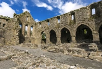 Ruins of an ancient stone abbey with towers and gravestones, set against a clear blue sky by the sea.
